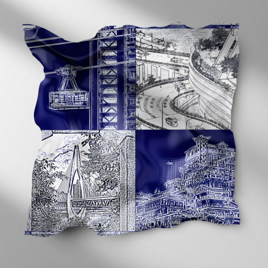 作品说明:此作品采用蓝晒工艺制作,蓝晒工艺是最古老的照片冲印方法。在不断的发展过程中,慢慢的运用到了各种事物上。在此次的丝巾设计当中,我采用了这一种工艺,体现了简约的风格特色。在图案上面我选择了重庆比较有特色同时又很小众的几个打卡地点,拍摄了四个角落里的独特风景,它们体现了重庆独有的魅力所在。将两者结合,制作出了独属于重庆自己的蓝晒丝巾作品。简约大方,却又不失华丽。